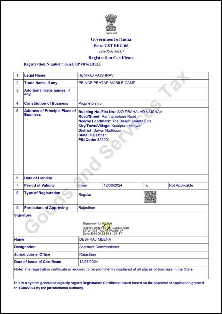 Address: Kultalpura Malyan, Near The Baagh Ananta Elite | Ranthambore Road | Dist: Sawai Madhopur | Rajasthan Pincode: 322001| Phone: 098878 69385 | | Email: princepratapmobilecamp@gmail.com